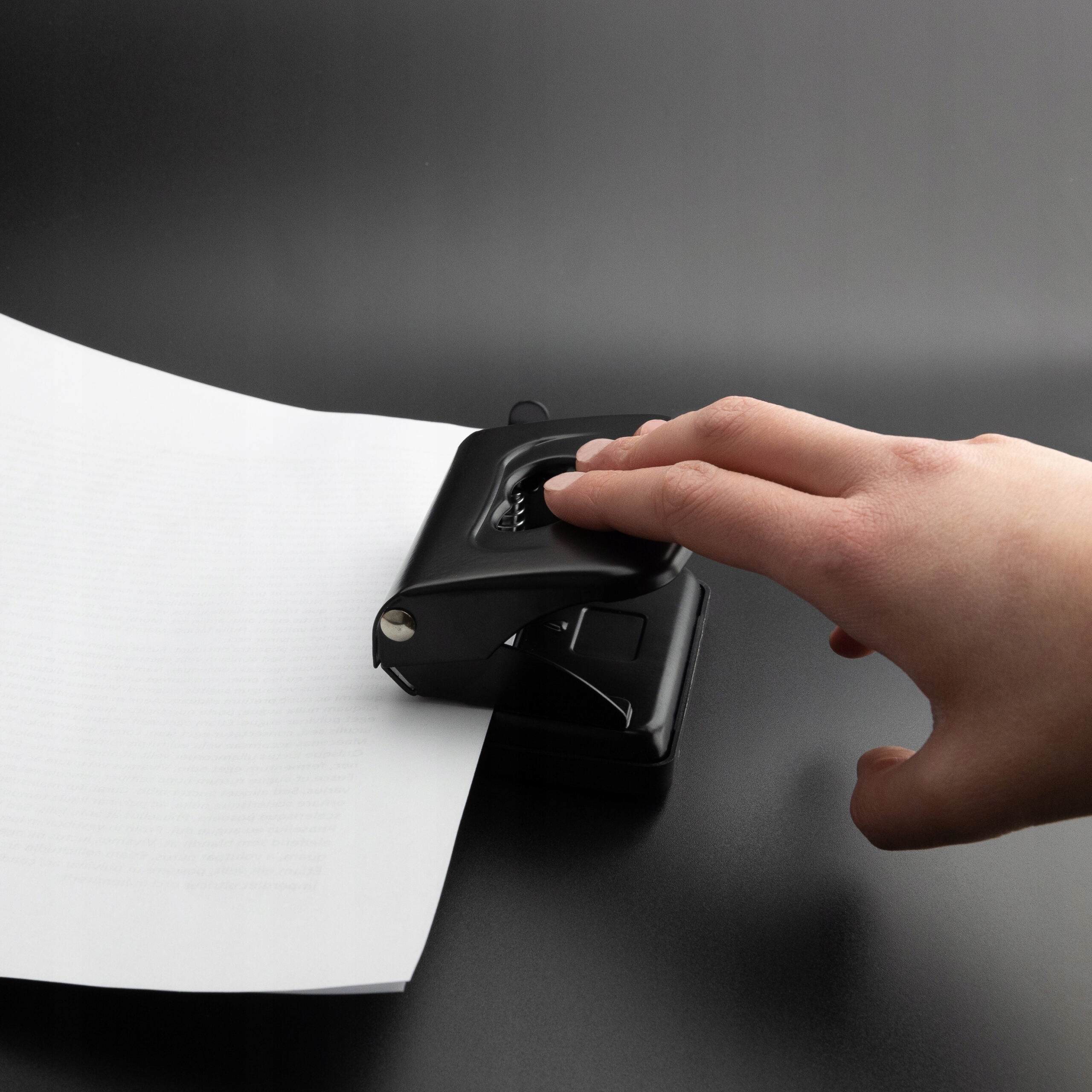 Dziurkacz biurowy wykonany został z trwałych materiałów – metalu i tworzywa sztucznego. Jest solidny i wytrzymały. Wyposażony jest w dwa ostre nożyki, które jednym ruchem wykonują okrągłe dziurki o standardowej wielkości 6 mm i odległości 80 mm. Maksymalna ilość kartek, jaką jest w stanie przedziurkować to 16 szt. Dodatkowo posiada specjalną miarkę, która wyznacza środek kartek w rozmiarach od A6 do A4. Dziurkacz jest również łatwy w czyszczeniu i przechowywaniu, co zwiększa jego funkcjonalność i trwałość – posiada specjalny pojemnik na ścinki, który wystarczy zdjąć i pozbyć się ich do kosza. Specyfikacja: