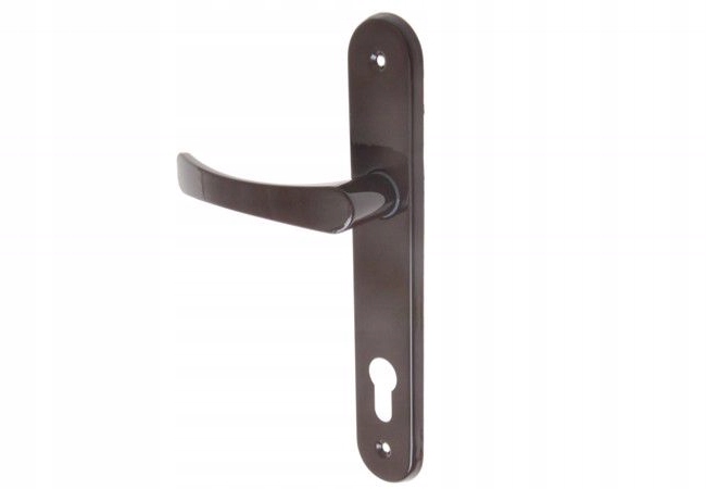 Klamka aluminiowa, malowana proszkowo na kolor brązowy. Solidna klamka, często wykorzystywana jest w starszym budownictwie oraz w mniej wymagających pomieszczeniach.