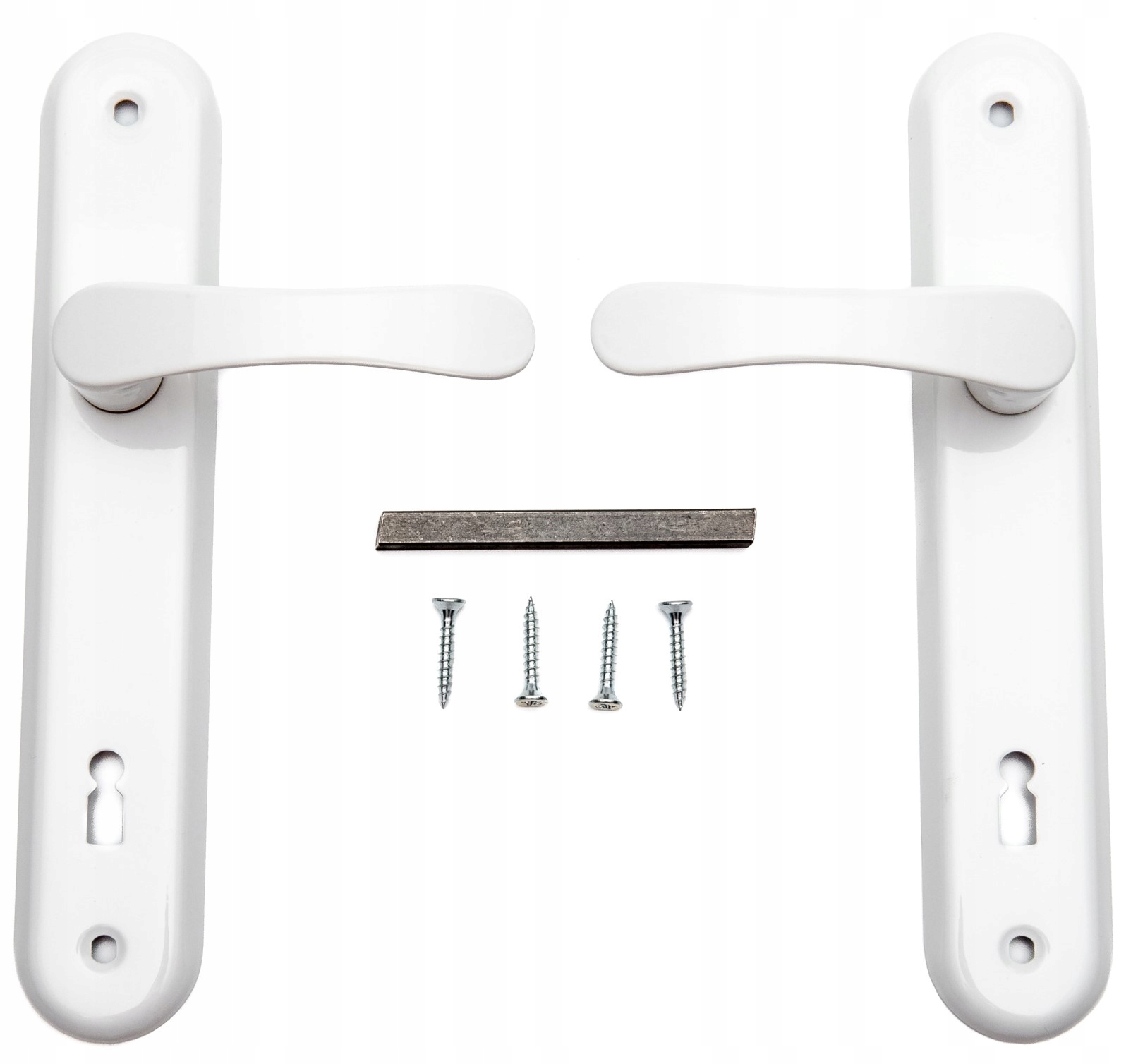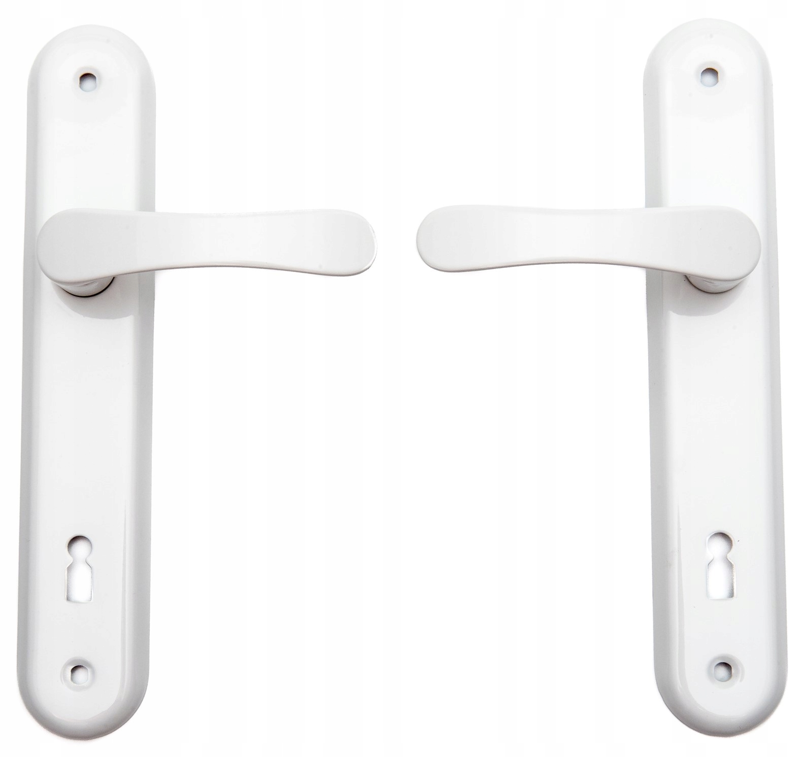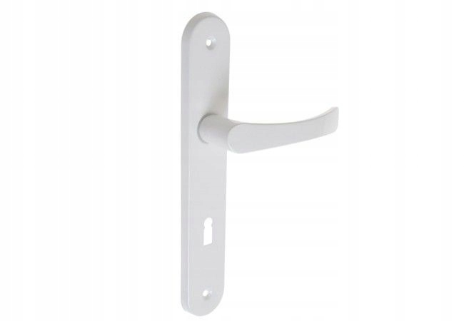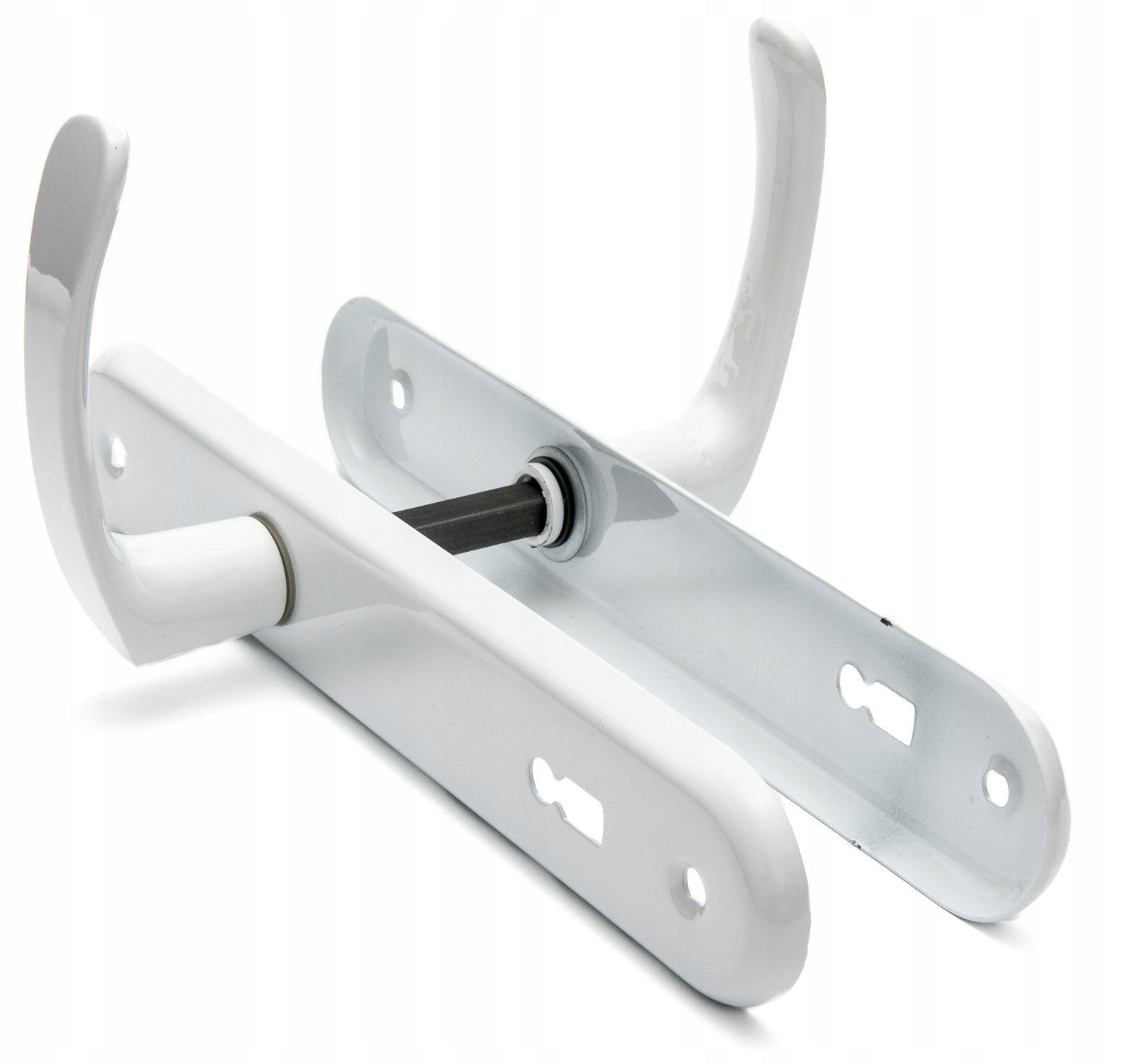 Klamka aluminiowa, malowana proszkowo na kolor biały. Solidna klamka, często wykorzystywana jest w starszym budownictwie oraz w mniej wymagających pomieszczeniach.