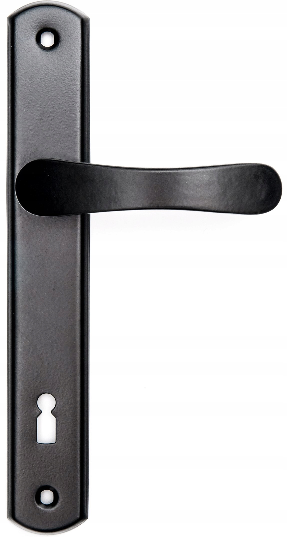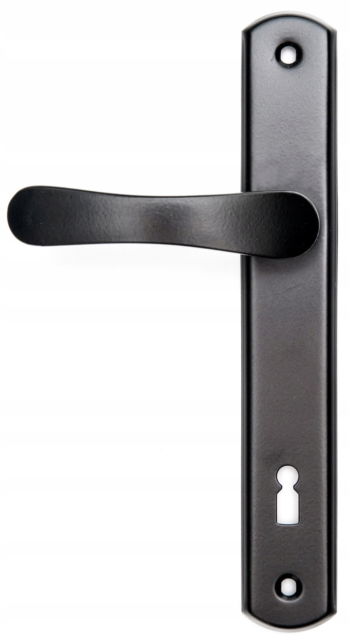 Klamka aluminiowa, malowana proszkowo na kolor czarny. Solidna klamka, często wykorzystywana jest w starszym budownictwie, do furtek i bram oraz w mniej wymagających pomieszczeniach.