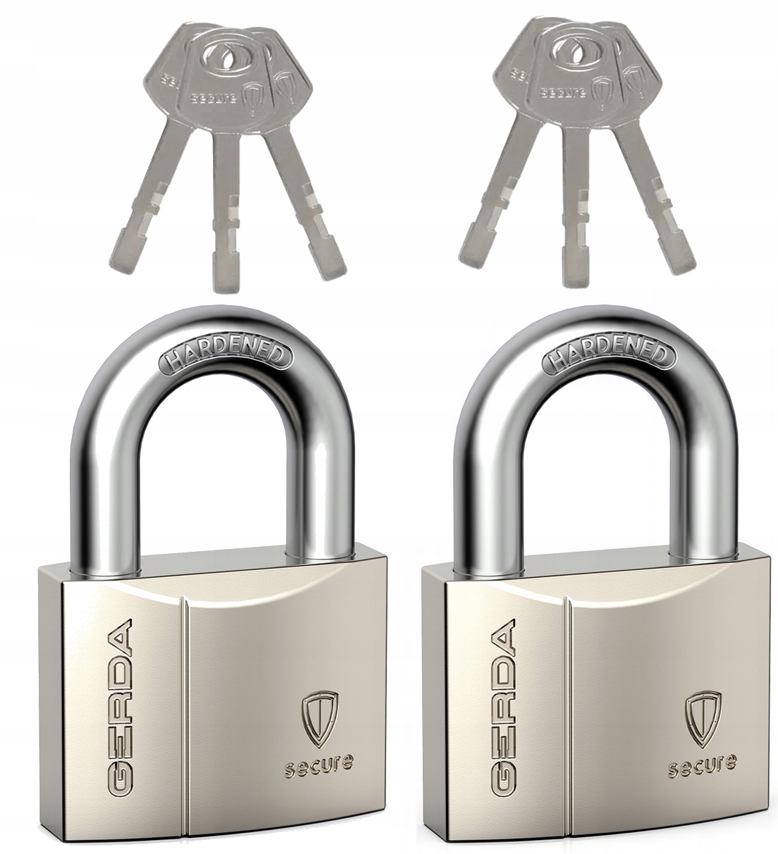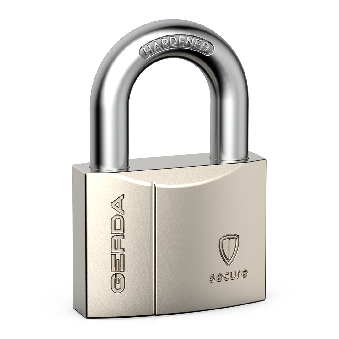 Bardzo mocna kłódka hartowana Gerda posiada korpus wykonany z litego mosiądzu pokrytego satyną, pałąk stalowy hartowany z powłoką niklowo-chromową oraz hartowany pierścień zabezpieczający mechanizm bębenkowy.
