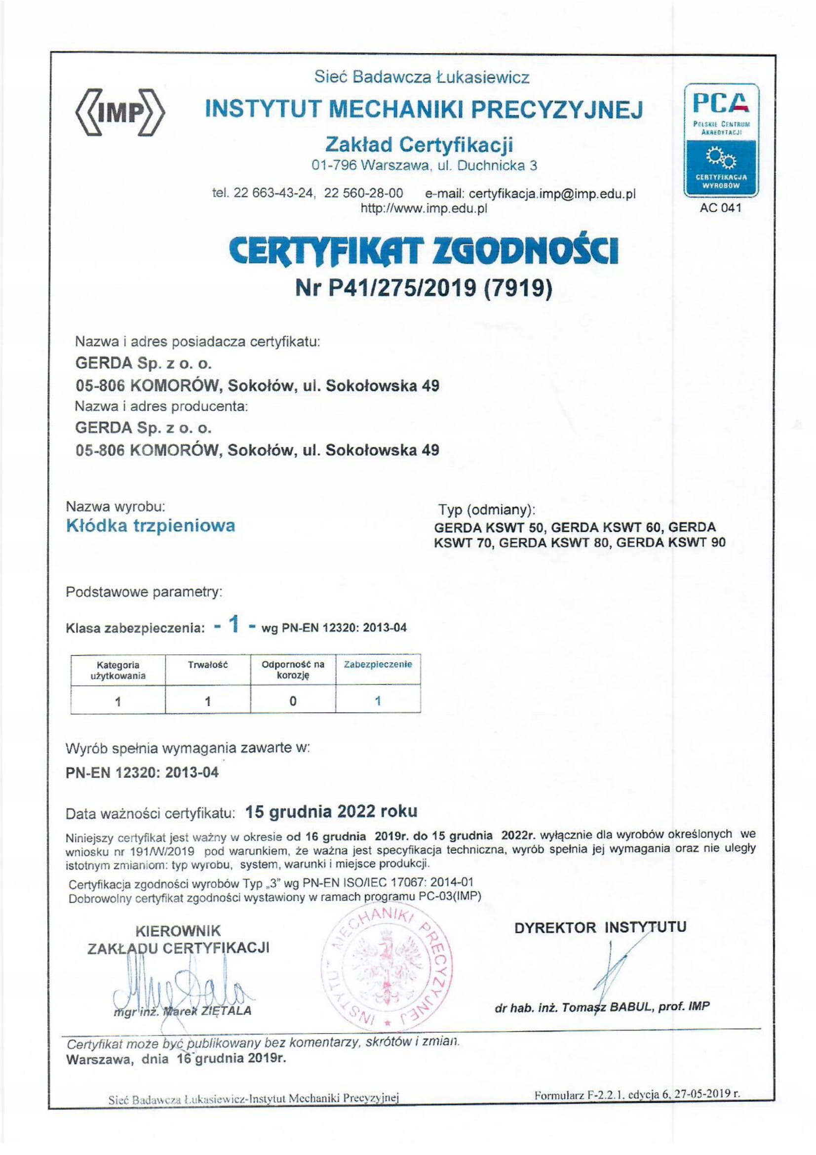 Kłódka atestowana w 1 klasie zabezpieczenia wg IMP (norma PN-EN 12320: 2013-04)