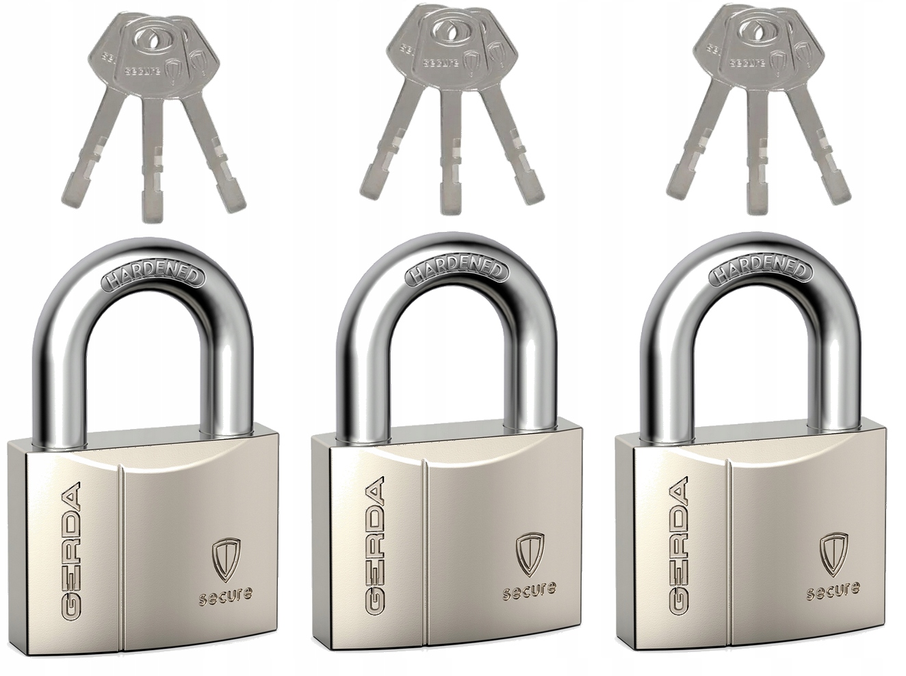 Bardzo mocna kłódka hartowana Gerda posiada korpus wykonany z litego mosiądzu pokrytego satyną, pałąk stalowy hartowany z powłoką niklowo-chromową oraz hartowany pierścień zabezpieczający mechanizm bębenkowy.