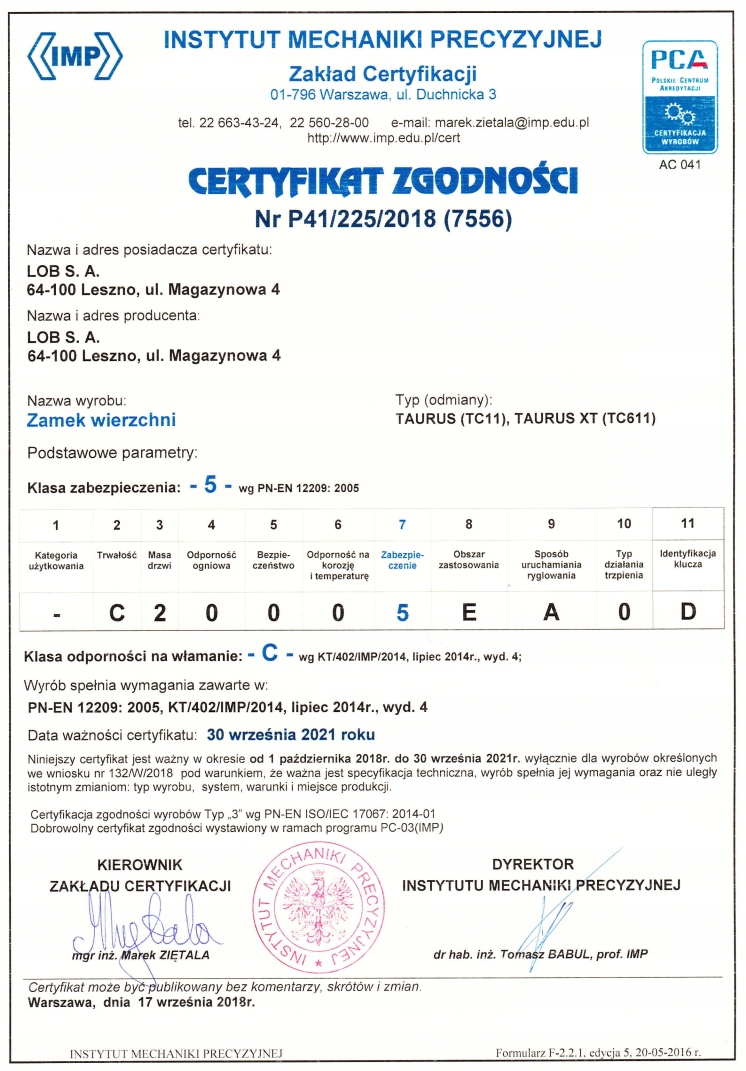 Taurus XT jest doskonałym zamkiem przeznaczonym do drzwi wejściowych. Wkładka zamka dodatkowo zabezpieczona jest tarczką antywłamaniową. Produkt przeznaczony jest do drzwi lewych i prawych o grubości skrzydła od 37 do 57 mm. Zamek posiada atest klasy 5 przyznany przez Instytut Mechaniki Precyzyjnej w Warszawie.