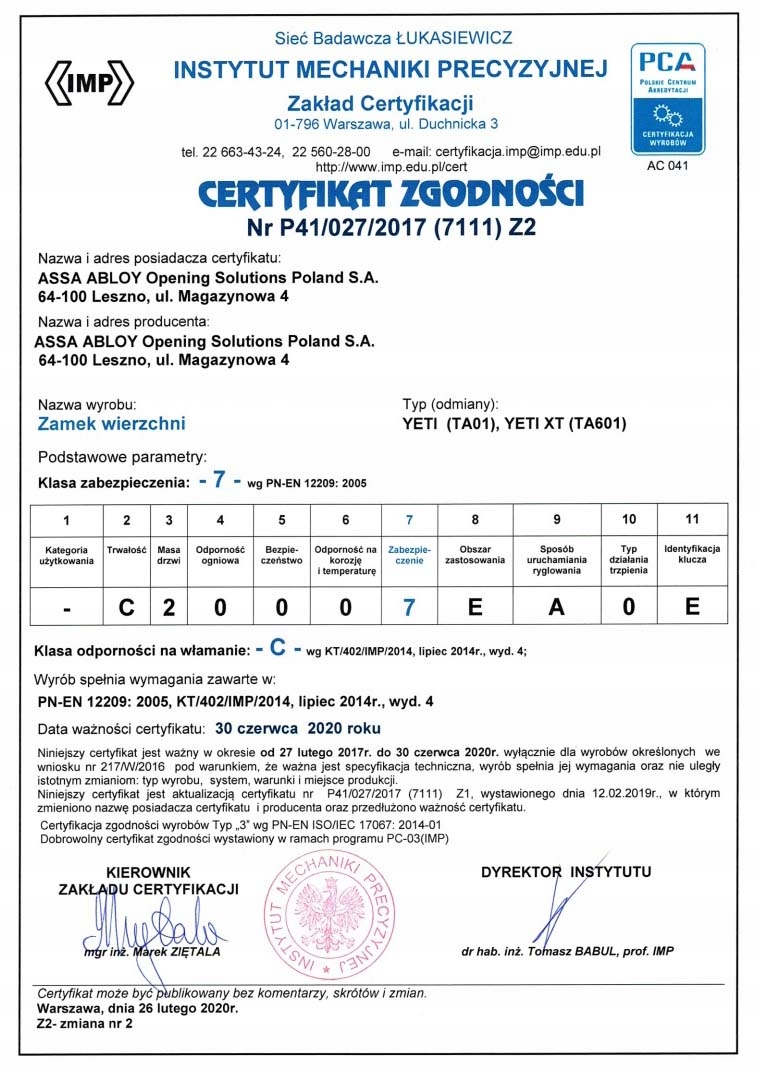 Konstrukcja zamka Yeti przebadana jest przez Instytut Mechaniki Precyzyjnej w Warszawie. Skrzynka pokryta jest estetyczną i doskonale wystylizowaną obudową, co sprawia, że zamek z niemal każdymi drzwiami stanowi doskonałą kompozycję.