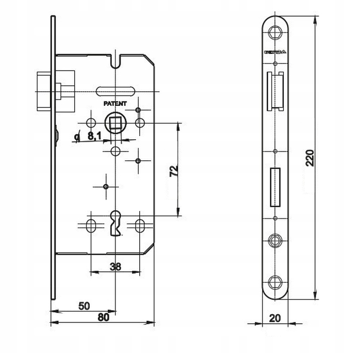 Zamek wpuszczany Gerda ZW 100 na klucz 72/50 mm
