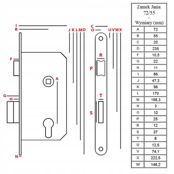 Zamek Jania 72/55 wpuszczany, zapadkowy. Używany do każdego typu drzwi (głównie drewnianych).