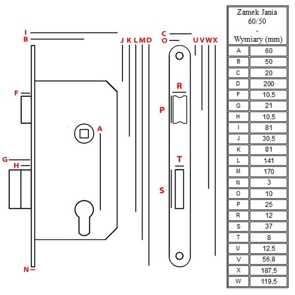 Zamek Jania 60/50 wpuszczany, zapadkowy. Używany do każdego typu drzwi (głównie drewnianych).