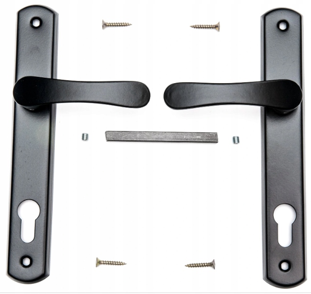 - Kompletna klamka aluminiowa z szyldem w kolorze czarnym (śruby mocujące, trzpień)