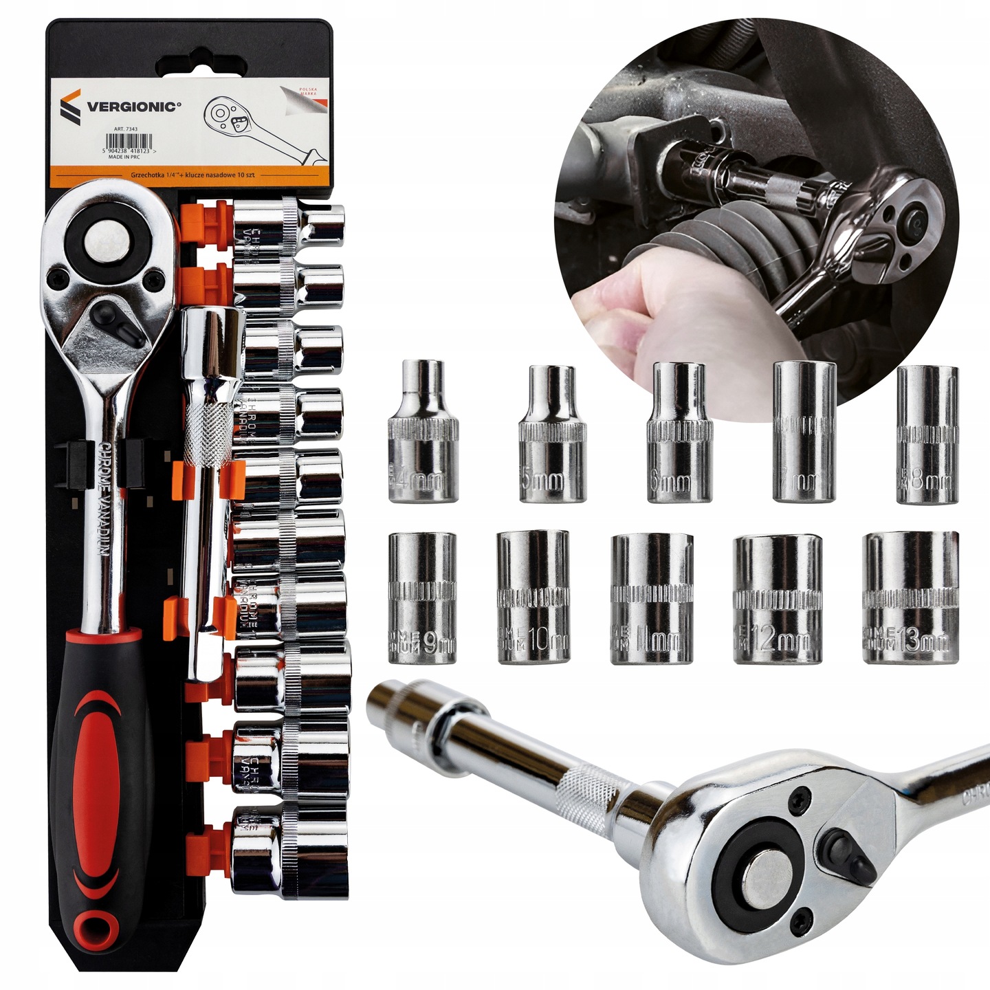 - 10 szt. Kluczy nasadowych w rozmiarach: 8, 10, 12, 13, 14, 15, 17, 19, 21, 24 mm